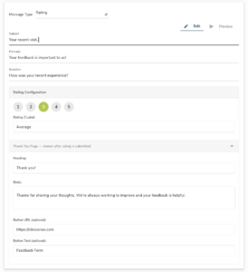 Yes. Click the Preview button in the message editor to see exactly what the thank you page looks like for each rating value. You can toggle between ratings and switch between email, SMS, and voice previews. You can also use the Test button to send yourself a test message and experience the full flow.