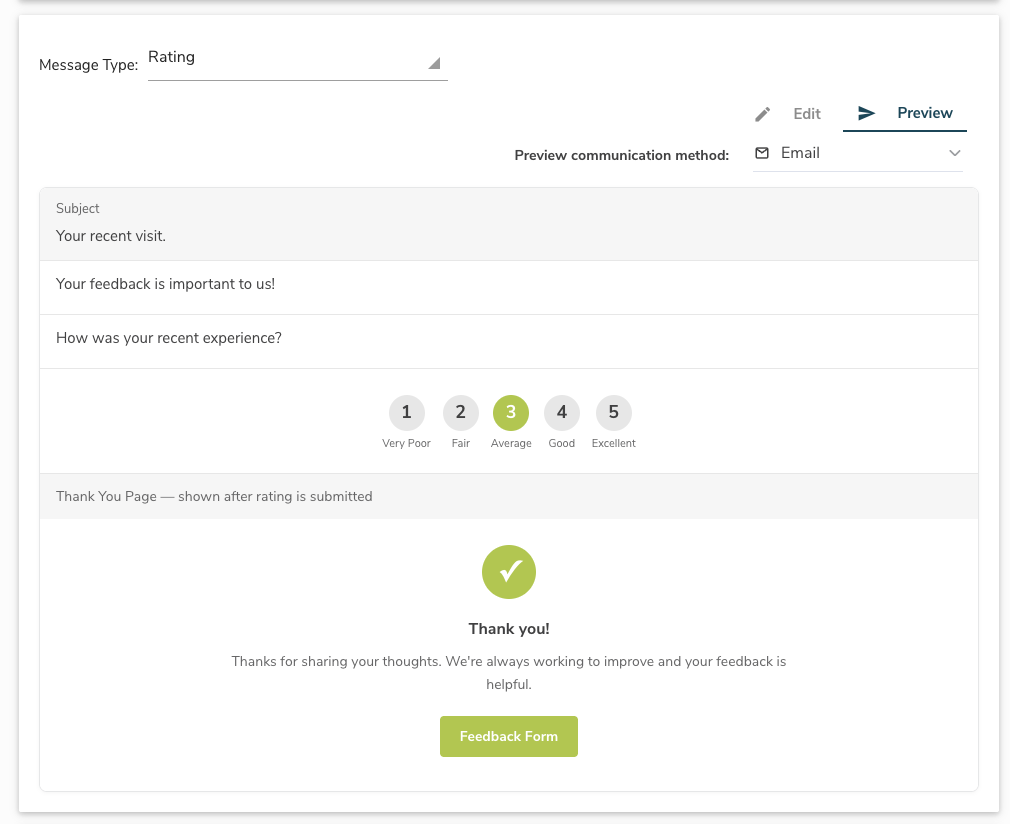 - Preview before you send: A new Preview button lets you see exactly what your patients will experience after submitting their rating. Toggle between ratings and switch between email, SMS, and voice views, all without sending a single message.